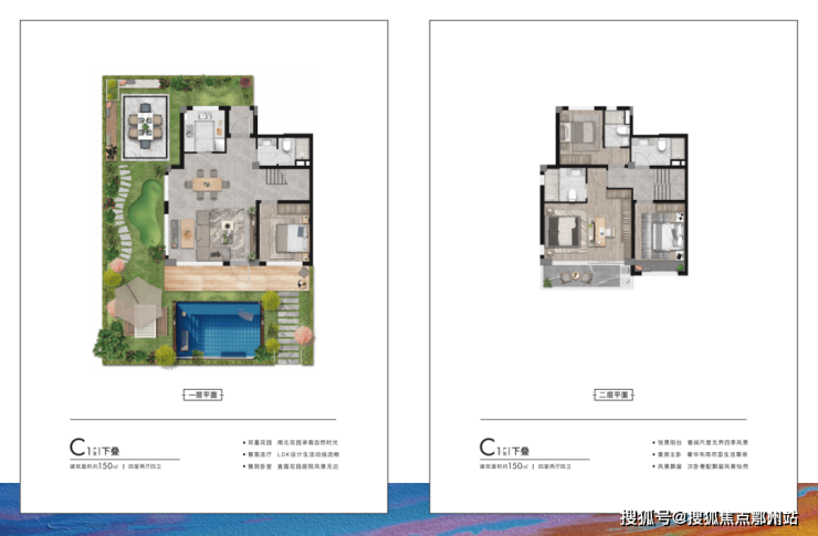 来看户型,面积段有两种——建面约95㎡下叠、上叠;建面约150㎡下叠、上叠。